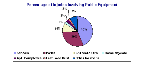 According to the National Safety Council, each year more than 200,000 children sustain injuries on playground equipment serious enough to require emergency room visits. The largest percentage of injuries, nearly 45%, occurred on school playgrounds. Approximately 15 children die per year from playground injuries.